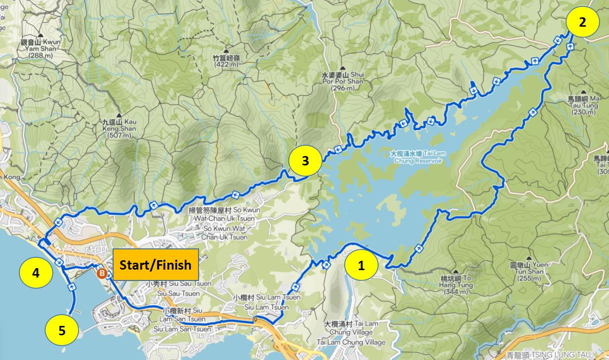 - 活動從黃金海岸商場開始經大欖水塘返回黃金海岸商場