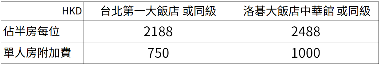 • 香港工作人員、台灣導遊及司機小費 HKD300。